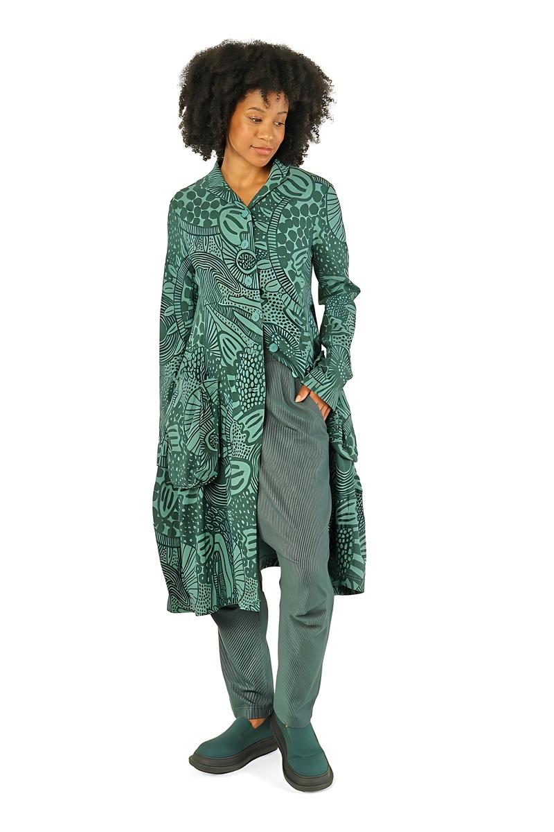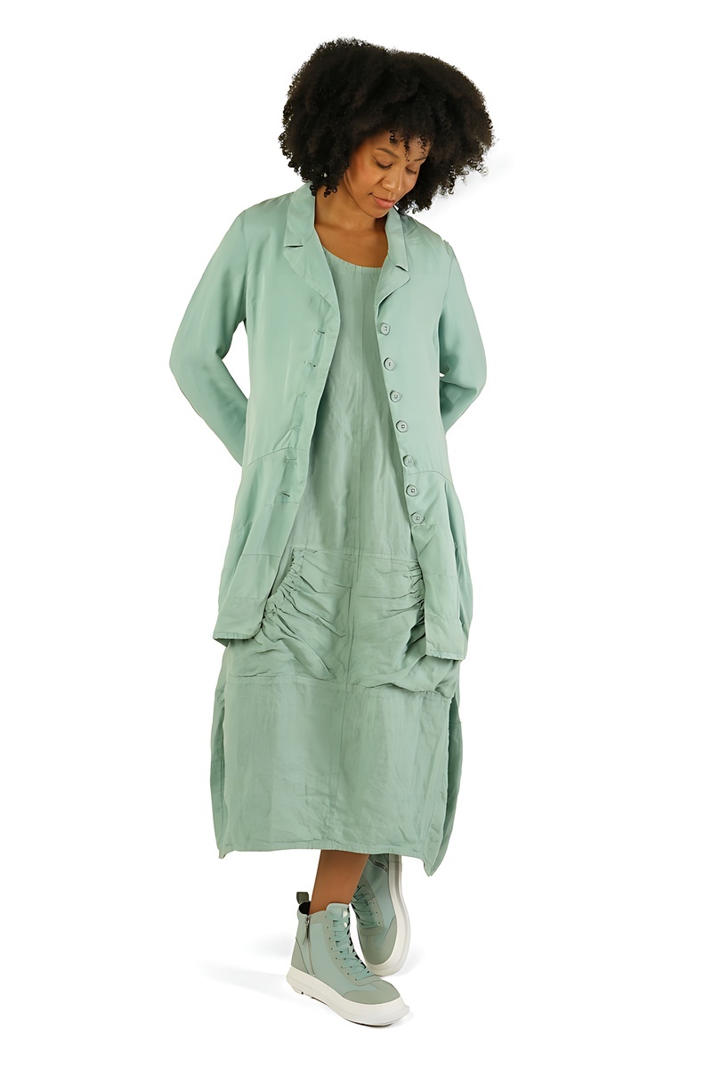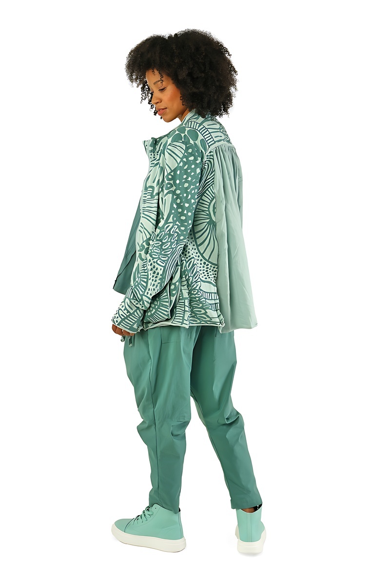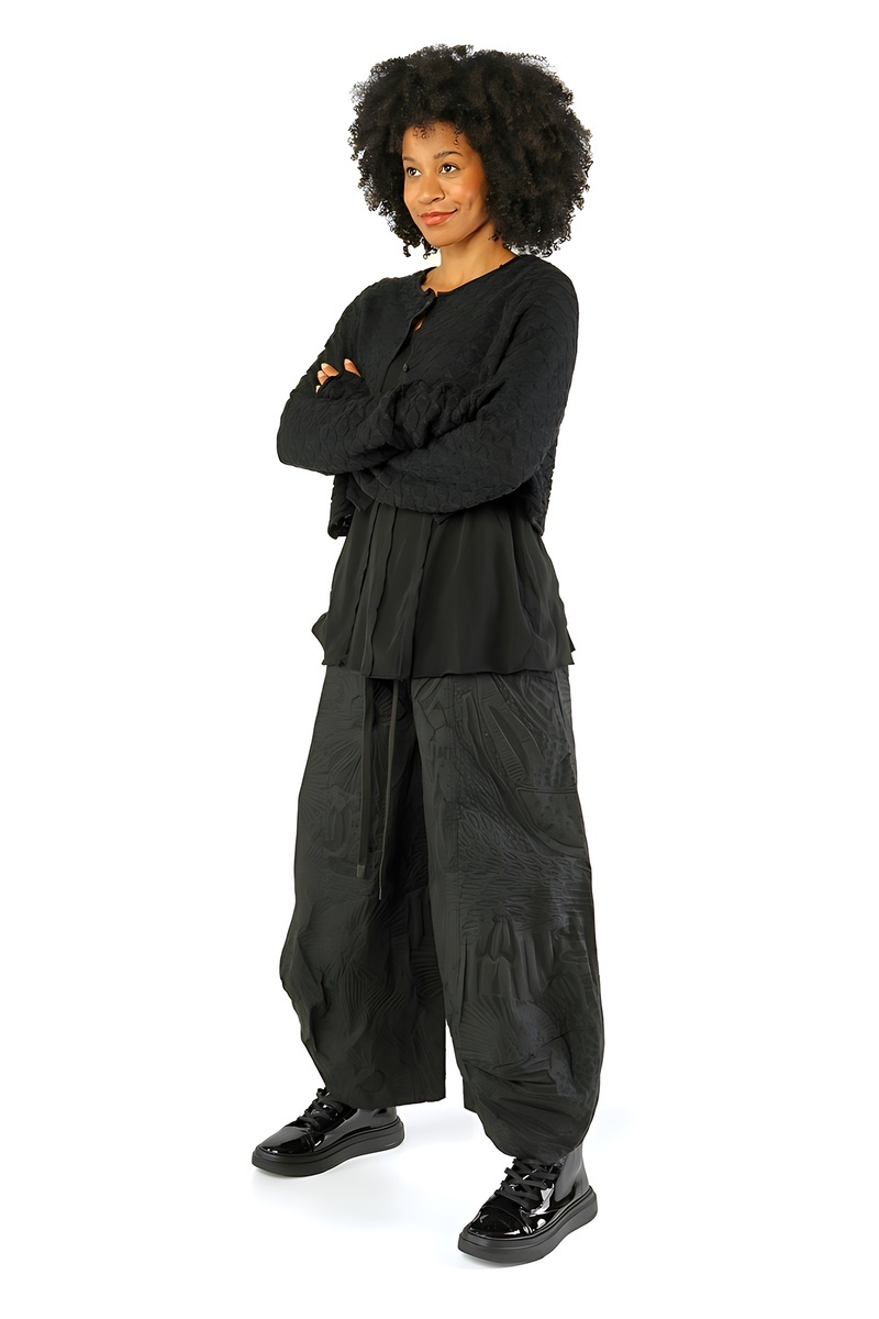 Le regard commence par le noir absolu, intense et graphique, socle intemporel de l’esthétique Rundholz. Il ancre le vestiaire, impose le contraste, et révèle ensuite toute la richesse des tons végétaux : un vert forêt profond, dense et feutré, suivi d’un vert mousse plus organique, presque tactile.