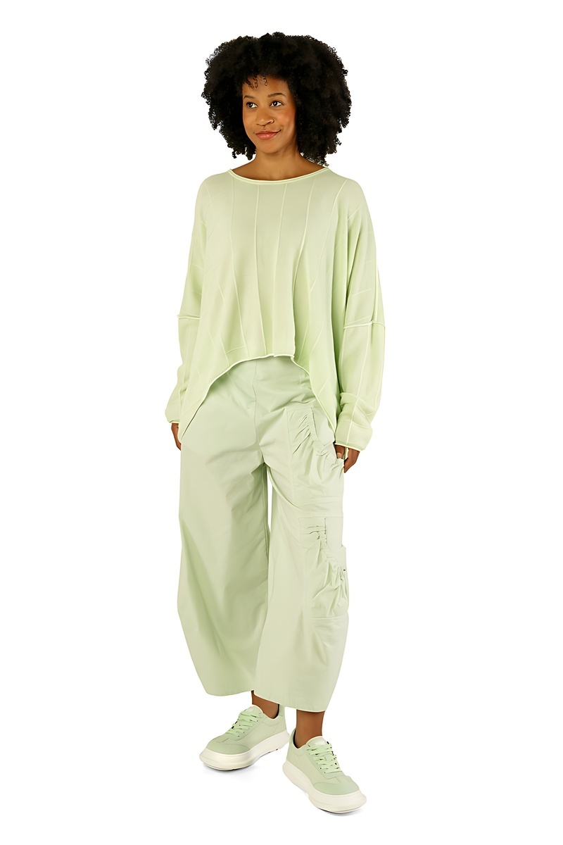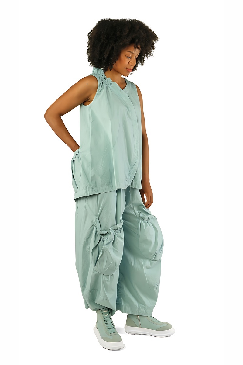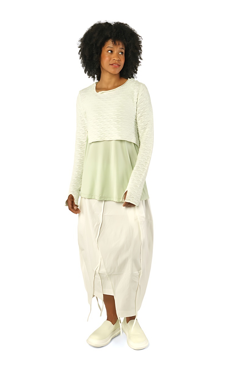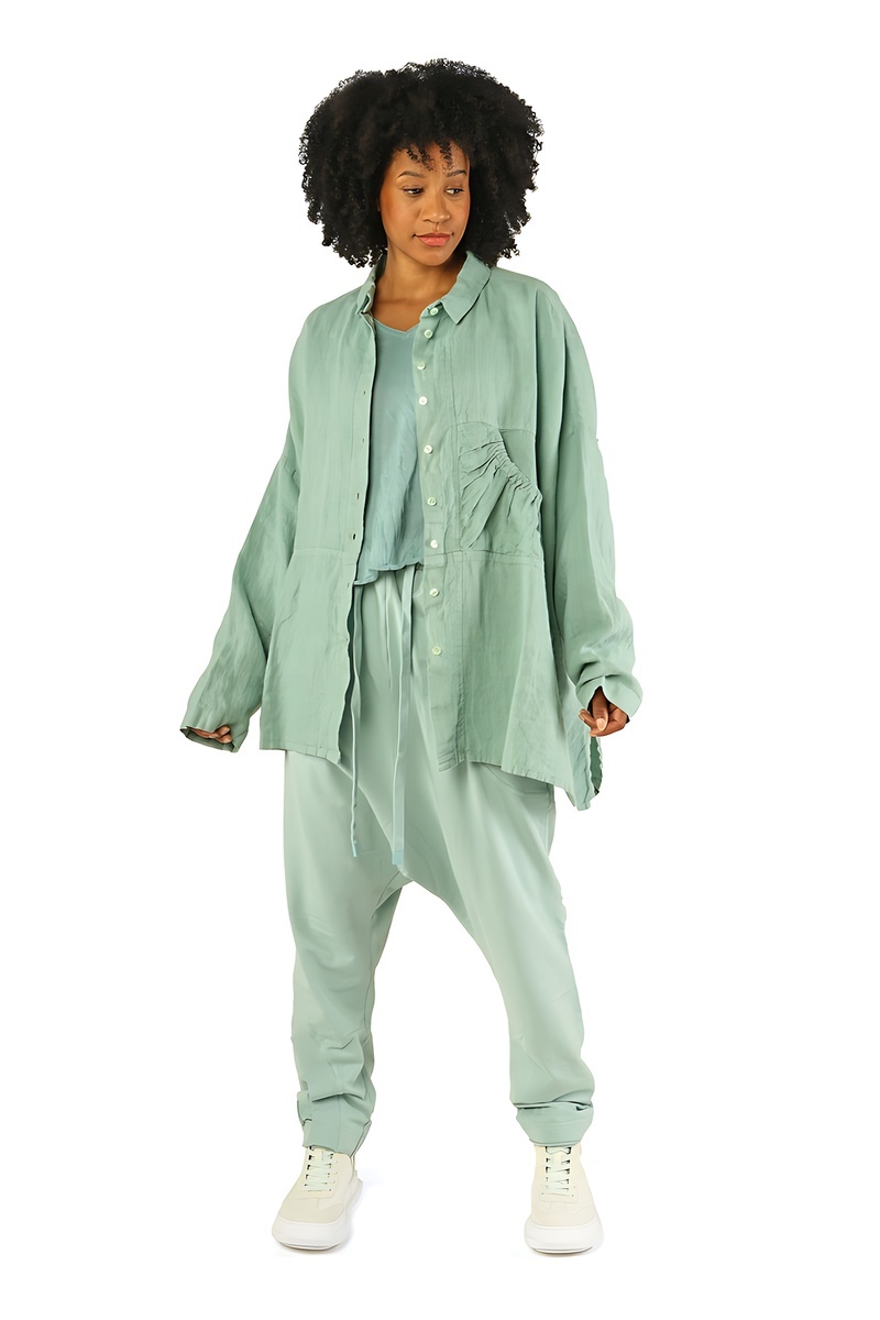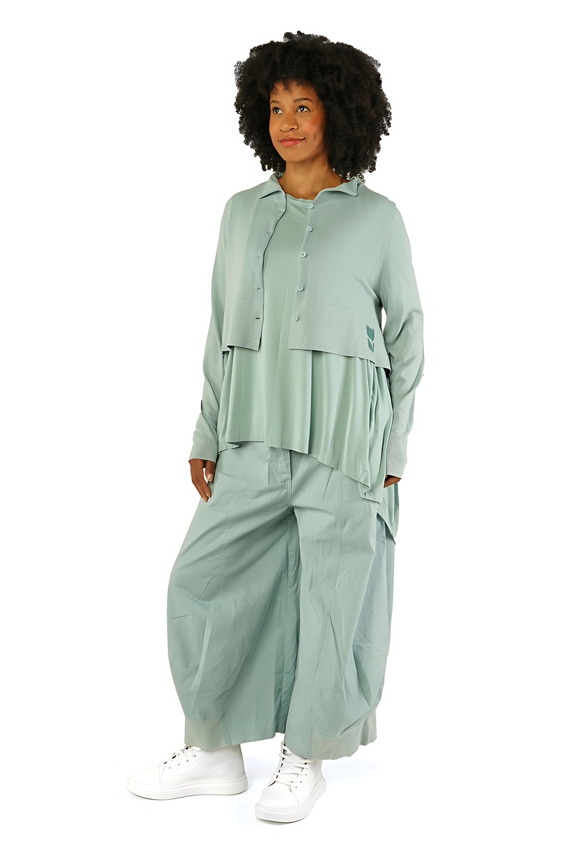 Le regard commence par le noir absolu, intense et graphique, socle intemporel de l’esthétique Rundholz. Il ancre le vestiaire, impose le contraste, et révèle ensuite toute la richesse des tons végétaux : un vert forêt profond, dense et feutré, suivi d’un vert mousse plus organique, presque tactile.